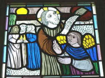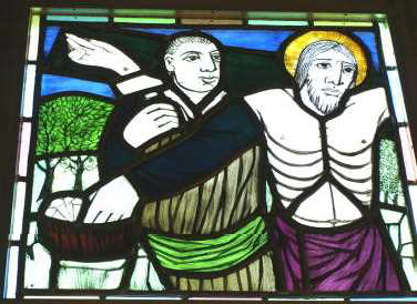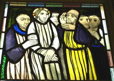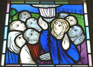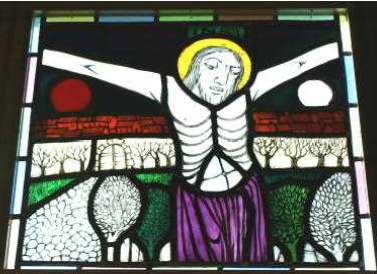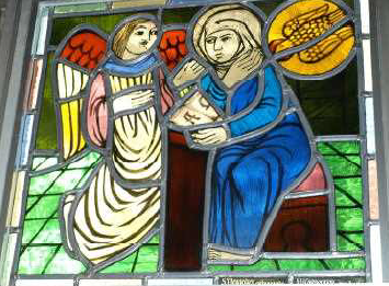 このステンドグラスは、ドミニコ会のアルベルト・カルペンティール神父様が松戸教会のために製作してくださったものです。聖書による十字架の道行き十四留に「お告げ」と「イエスの昇天」とを加えた16枚で構成され、祭壇に向かって右側に8枚、また左側に8枚あります。